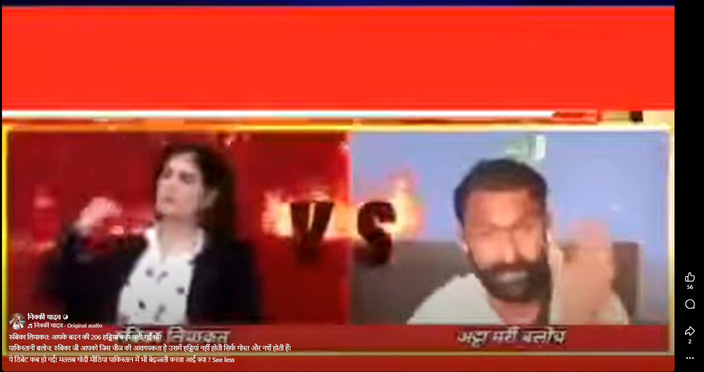 रूबिका लियाकत के शो में जवाब देते हुए पाकिस्तानी शख्स द्वारा उनपर अश्लील टिप्पणी किए जाने के दावे से वायरल इस वीडियो की पड़ताल में हमें सबसे पहले रूबिका लियाकत द्वारा बोले जा रहे शब्दों की मदद से गूगल सर्च किया. इस दौरान हमें एक फेसबुक अकाउंट से 27 अक्टूबर 2025 को अपलोड किया गया वीडियो मिला, जो रूबिका लियाकत के शो “गूंज” का एक क्लिप था, जिसमें रूबिका लियाकत ने सपा प्रवक्ता फराज किदवई से सवाल पूछते हुए 206 हड्डियों वाली टिप्पणी की थी.