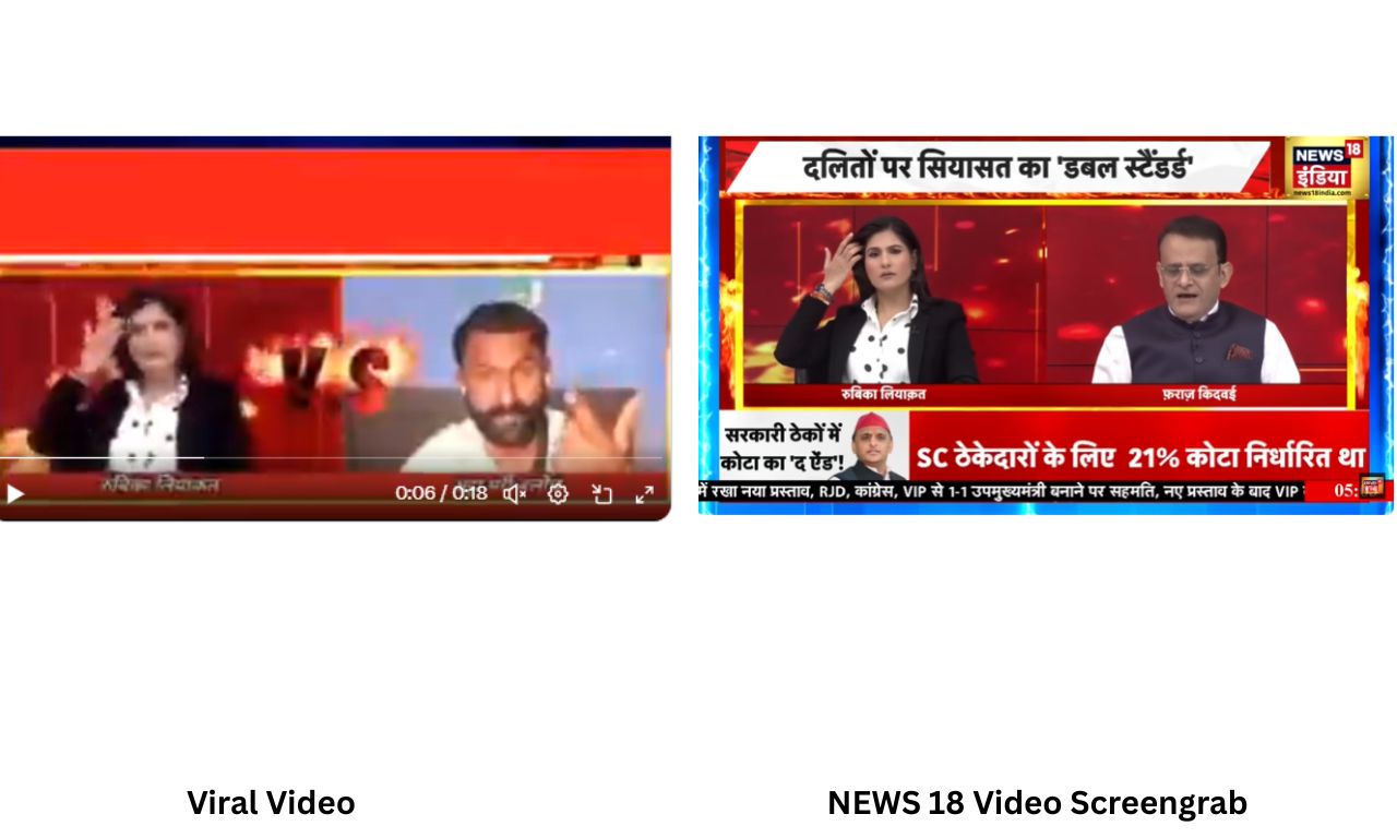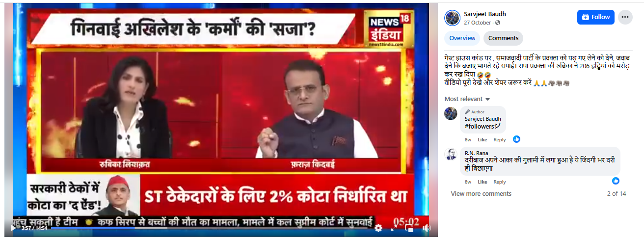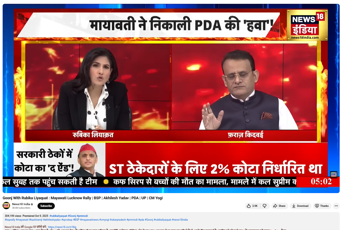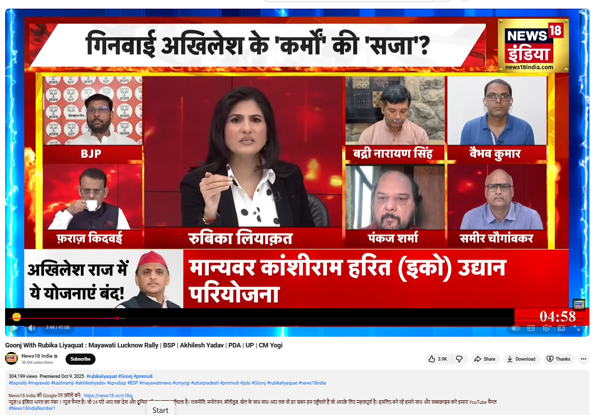 इसके बाद ऊपर मिली जानकारी के आधार पर कीवर्ड सर्च करने पर हमें इस कार्यक्रम का पूरा वीडियो 9 अक्टूबर 2025 को न्यूज 18 इंडिया के यूट्यूब अकाउंट से लाइव किया गया मिला. इस वीडियो में रूबिका लियाकत ने लखनऊ में आयोजित बसपा की रैली में मायावती के भाषणों और उसके बाद अखिलेश द्वारा द्वारा दी गई प्रतिक्रियाओं पर डिबेट किया था. इस डिबेट शो में भाजपा प्रवक्ता राजेश चौधरी, समाजवादी प्रवक्ता फराज किदवई समेत कई अन्य राजनीतिक विश्लेषक मौजूद थे, जिसे आप नीचे तस्वीरों में देख सकते हैं.