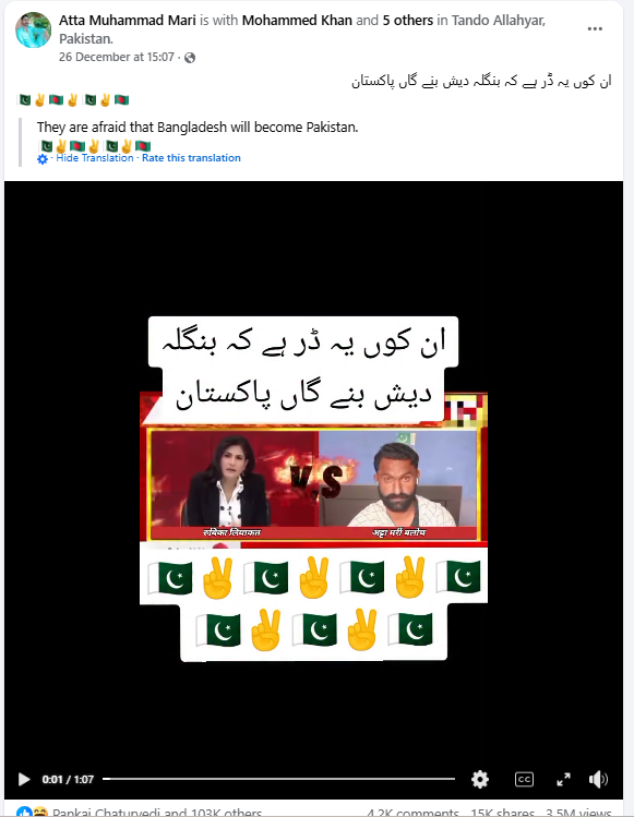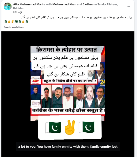 इसी दौरान हमें यह वायरल वीडियो उक्त शख्स अट्टा मुहम्मद मर्री के फेसबुक अकाउंट से 26 दिसंबर 2025 को अपलोड किया हुआ भी मिला, जिसमें वह यह दिखाता नजर आ रहा है कि वह न्यूज 18 पर रूबिका लियाकत के कार्यक्रम में आमंत्रित था.