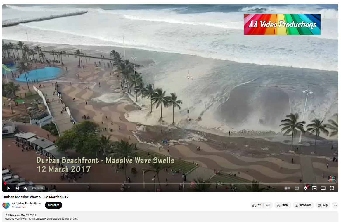 करीब 3 मिनट 12 सेकेंड के वीडियो के शुरूआती हिस्से में ही वायरल वीडियो वाले दृश्य मौजदू थे. वीडियो में इसे साउथ अफ्रीका के डरबन शहर के बीच फ्रंट पर 12 मार्च 2017 को आई तेज लहर का बताया गया था. इसके अलावा वीडियो में अलग-अलग एंगल से रिकॉर्ड किए गए अन्य दृश्य भी मौजूद थे.