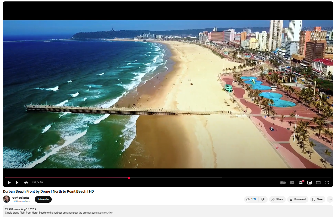 अपनी जांच में हमने वीडियो में दिख रहे लोकेशन का भी पता लगाया. इस दौरान हमें 18 अगस्त 2019 को अपलोड किए गए एक यूट्यूब वीडियो में भी 1 मिनट 34 सेकेंड पर वह जगह दिखाई दिया. यह यूट्यूब वीडियो डरबन बीच फ्रंट का ड्रोन फुटेज था.