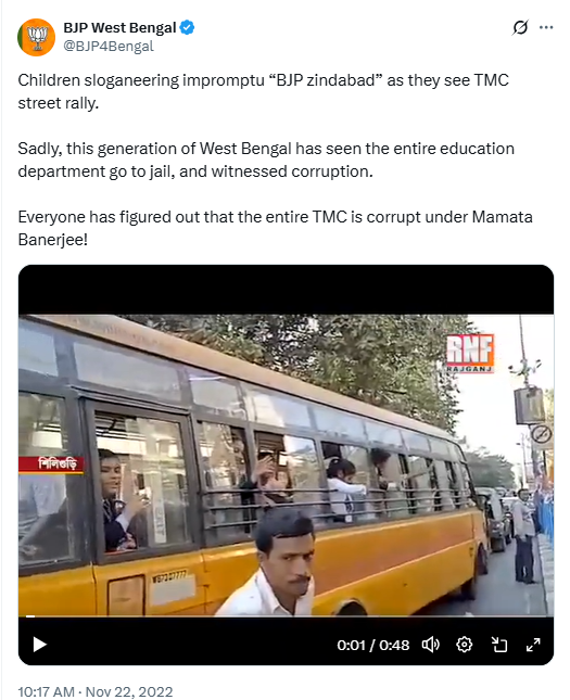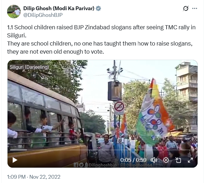 स्कूली बच्चों द्वारा ‘वोट चोरी’ के खिलाफ निकली रैली के दौरान भाजपा के समर्थन में नारे लगाए जाने के दावे की पड़ताल के लिए हमने वीडियो के कीफ्रेम्स को रिवर्स सर्च किया। इस दौरान पश्चिम बंगाल के भाजपा नेता दिलीप घोष के एक्स हैंडल से 22 नवंबर 2022 को पोस्ट किया गया यह वीडियो मिला। वीडियो में झंडा लिए भारी संख्या में महिलाएं और पुरुष बस के सामने वाली सड़क से गुजर रहे हैं। पोस्ट के कैप्शन में उन्होंने लिखा है, “स्कूल के बच्चों ने सिलिगुड़ी में टीएमसी की रैली को देखकर “बीजेपी ज़िंदाबाद” के नारे लगाए। वे तो सिर्फ स्कूल के बच्चे हैं, किसी ने उन्हें नारे लगाना नहीं सिखाया है, और उनकी अभी वोट देने की उम्र भी नहीं हैं।” इससे इतना तो स्पष्ट है कि यह वीडियो करीब तीन साल पुराना है और हालिया ‘वोट चोरी’ विवाद से संबंधित नहीं है।