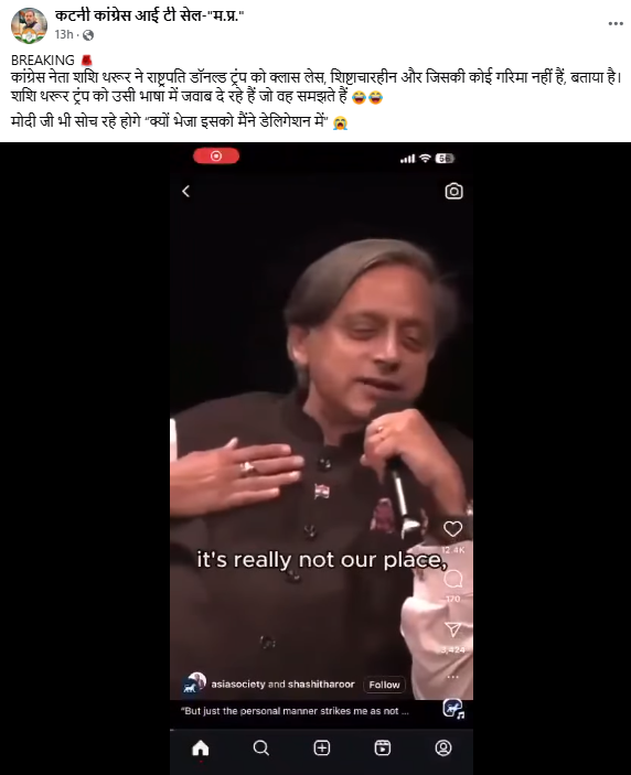 इसके अलावा, इस वीडियो को फेसबुक पर भी इसी तरह के दावे वाले कैप्शन के साथ शेयर किया गया है, जिसमें लिखा हुआ है “कांग्रेस नेता शशि थरूर ने राष्ट्रपति डॉनल्ड ट्रंप को क्लास लेस, शिष्टाचारहीन और जिसकी कोई गरिमा नहीं हैं, बताया है। शशि थरूर ट्रंप को उसी भाषा में जवाब दे रहे हैं जो वह समझते हैं. मोदी जी भी सोच रहे होगे क्यों भेजा इसको मैंने डेलिगेशन में”.