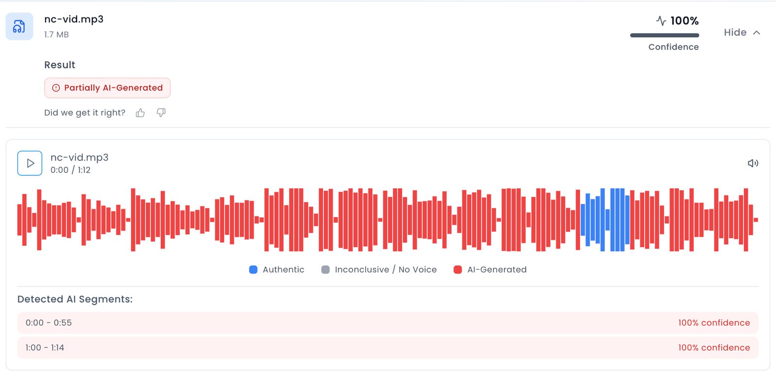 हमने अपनी जांच में यह भी पता करने की कोशिश की कि क्या वायरल वीडियो एआई की मदद से एडिट किया गया है? इसके लिए हमने वीडियो को Resemble एआई डिटेक्शन टूल की मदद से जांचा. इस टूल ने वीडियो में मौजूद ऑडियो के एआई जेनरेटेड होने के संकेत दिए.