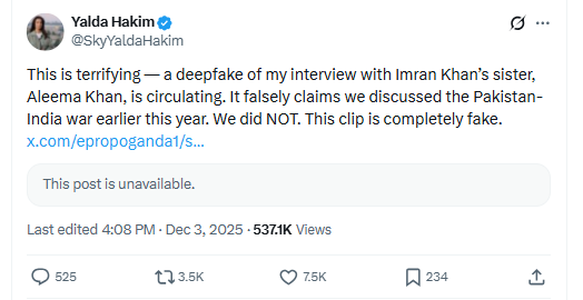 जांच में हमने यह भी पाया कि यलदा हाकिम ने अपने X अकाउंट से भी दावे का खंडन करते हुए एक पोस्ट किया, जिसमें उन्होंने लिखा कि “यह बेहद डरावना है. इमरान खान की बहन अलीमा खान के साथ मेरे इंटरव्यू का एक डीपफेक वीडियो वायरल हो रहा है. इसमें झूठा दावा किया गया है कि हमने इस साल हुए पाकिस्तान-भारत युद्ध पर चर्चा की थी. हमने ऐसा बिल्कुल नहीं किया. यह क्लिप पूरी तरह से फर्जी है”.