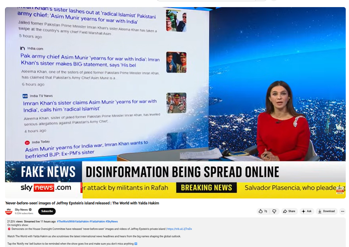 इसके बाद हमने इस पूरे कार्यक्रम का वीडियो देखा, जो 3 दिसंबर 2025 को स्काई न्यूज के यूट्यूब अकाउंट से अपलोड किया गया था. द वर्ल्ड विथ यलदा हाकिम के इस शो में 13 मिनट से लेकर 18 मिनट के बीच वह हिस्सा मिला, जिसमें इमरान खान की बहन अलीमा खानम का इंटरव्यू मौजूद था.