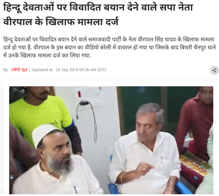 रिपोर्ट में बताया गया था कि 2018 में मुहर्रम के दौरान बरेली में ताजिया रोके जाने के विरोध में लोगों ने नेशनल हाइवे 24 पर नकटिया पुलिस चौकी के पास ताजिये रखकर जमकर उत्पात मचाया था. इस घटना के बाद सपा और कांग्रेस के नेता उमरिया गए थे और बीजेपी के नेता खजुरिया गांव गए थे. इसी दौरान समाजवादी पार्टी के नेता वीरपाल सिंह यादव ने यह टिप्पणी की थी. उनकी टिप्पणी का वीडियो वायरल होने के बाद पुलिस ने बिथरी चैनपुर थाने में मामला दर्ज किया था.