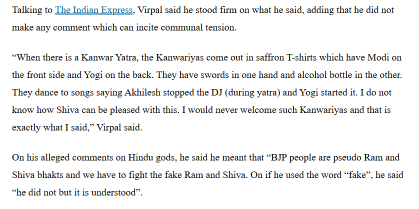 इसके बाद बिथरी चैनपुर पुलिस स्टेशन के तत्कालीन सब इंस्पेक्टर ब्रजपाल सिंह की शिकायत के बाद वीरपाल सिंह यादव के खिलाफ आईपीसी की धारा 295 A और 504 के तहत मामला दर्ज किया गया था. हालांकि, इंडियन एक्सप्रेस को दिए गए बयान में वीरपाल सिंह यादव ने कहा था कि उनके बयान को गलत तरीके से पेश किया जा रहा है.