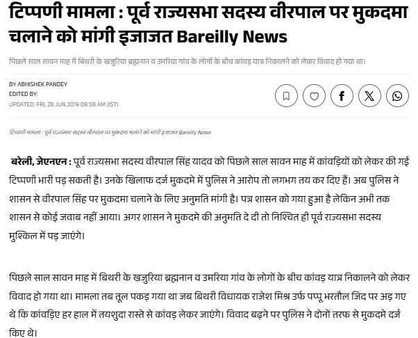 इस मामले से जुड़ी एक रिपोर्ट हमें दैनिक जागरण की वेबसाइट पर भी 28 जून 2019 को प्रकाशित मिली. इस रिपोर्ट में बताया गया था कि कांवड़ियों को लेकर की गई टिप्पणी मामले में पुलिस ने वीरपाल सिंह यादव के खिलाफ आरोप लगभग तय कर दिए थे और शासन से उनपर मुकदमा चलाने के लिए अनुमति भी मांगी थी.
