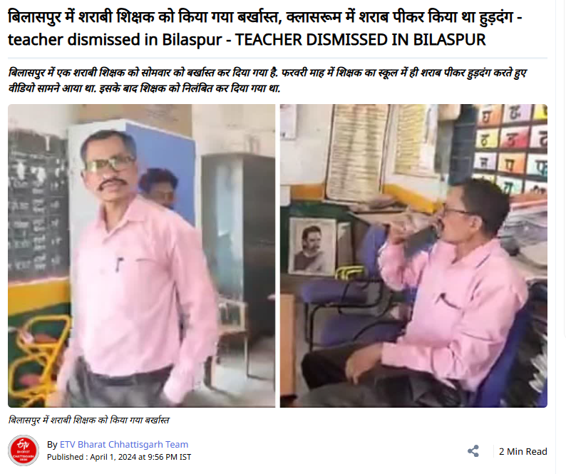 स्कूल में शराब पीते शिक्षक के वीडियो की पड़ताल के लिए हमने इसके कीफ्रेम्स को रिवर्स इमेज सर्च किया। इस दौरान हमें ईटीवी भारत की वेबसाइट पर 1 अप्रैल 2024 को प्रकाशित एक रिपोर्ट मिली। इस रिपोर्ट में वायरल वीडियो के दृश्य मौजूद हैं। रिपोर्ट में बताया गया है कि यह घटना छत्तीसगढ़ के बिलासपुर की है, जहां क्लासरूम में शराब पीकर हुड़दंग मचाने वाले एक टीचर को बर्खास्त कर दिया गया। इस वीडियो को बिलासपुर के मस्तूरी का बताया गया है, जहां 28 फरवरी 2024 को टीचर का वीडियो सामने आने के बाद जिला शिक्षाधिकारी ने जांच करके शिक्षक संतोष केवट को बर्खास्त कर दिया था। खबर में बताया गया है कि उक्त शिक्षक ने अपने सहकर्मियों के साथ गाली-गलौज भी की थी।