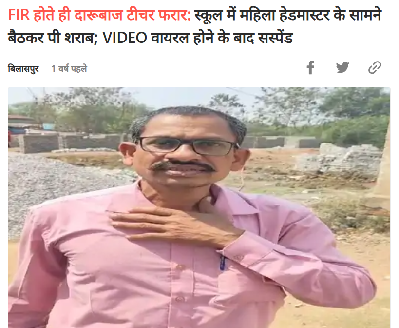 संबंधित कीवर्ड्स को सर्च करने पर हमें दैनिक भास्कर की वेबसाइट पर भी इस घटना से संबंधित रिपोर्ट मिली। इस रिपोर्ट में भी वायरल वीडियो के दृश्य मौजूद हैं। रिपोर्ट में बताया गया है कि यह घटना बिलासपुर की है, जहां स्कूल में महिला हेडमास्टर के सामने बैठकर शराब पीने वाले शिक्षक को सस्पेंड कर दिया गया था।