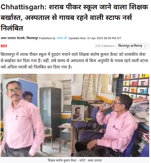 स्कूल में शराब पीने वाले शिक्षक के वायरल वीडियो पर ज्यादा जानकारी के लिए हमने बिलासपुर स्थित मस्तूरी प्रखंड के शिक्षाधिकारी शिवराम टंडन से फोन पर बात की। उन्होंने बताया कि शिक्षक का यह वीडियो पुराना है और उनके प्रखंड के ही एक स्कूल का है। उन्होंने बताया कि शिक्षक का नाम संतोष केवट है। वीडियो सामने आने के बाद साल 2024 में ही उसे सेवा से बर्खास्त कर दिया गया था।