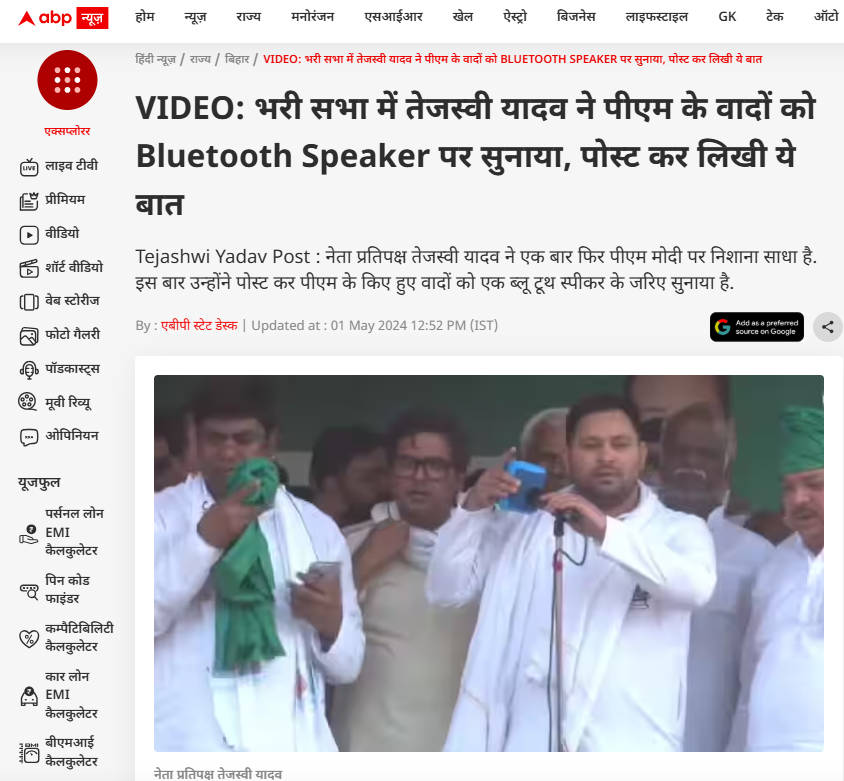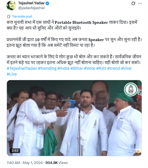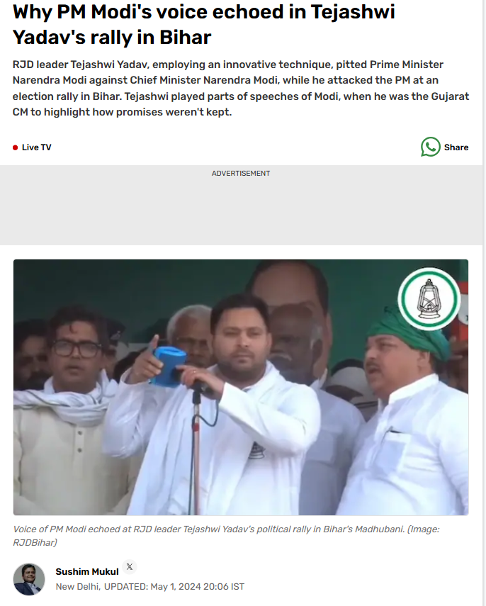 रिपोर्ट में बताया गया था कि लोकसभा चुनाव 2024 में प्रचार के दौरान राजद नेता तेजस्वी यादव ने मधुबनी की सभा में लोगों को संबोधित करने का अनोखा तरीका अपनाया. उन्होंने एक पोर्टेबल ब्लूटूथ स्पीकर पर पीएम मोदी के उस समय के भाषण चलाए, जब वे गुजरात के मुख्यमंत्री थे. रिपोर्ट में तेजस्वी यादव के उस X पोस्ट का भी ज़िक्र था, जिसमें उन्होंने इस भाषण का वीडियो शेयर किया था.