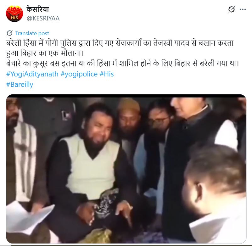 एक एक्स यूज़र ने वीडियो पोस्ट करते हुए लिखा, “बरेली हिंसा में योगी पुलिस द्वारा दिए गए सेवाकार्यों का तेजस्वी यादव से बखान करता हुआ बिहार का एक मौलाना. बेचारे का कुसूर बस इतना था की हिंसा में शामिल होने के लिए बिहार से बरेली गया था.” पोस्ट का आर्काइव यहां देखें. ऐसे ही दावों वाले अन्य पोस्ट यहां, यहां, यहां, यहां और यहां देखें.