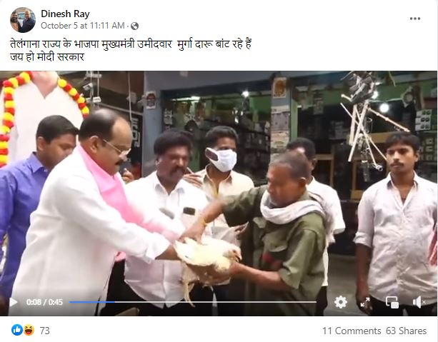 सोशल मीडिया पर एक वीडियो शेयर कर दावा किया जा रहा है कि तेलंगाना के बीजेपी से मुख्यमंत्री उम्मीदवार लोगों को शराब और मुर्गा बांट रहे हैं।