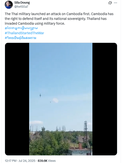 दूसरे वीडियो में कुछ लड़ाकू विमान उड़ रहे होते हैं तभी इनमें से एक विमान अचानक से दुर्घटनाग्रस्त होकर नीचे गिर जाता है. वीडियो को X पर इस दावे से शेयर किया गया है कि कंबोडिया ने थाईलैंड के विमान को मार गिराया है.