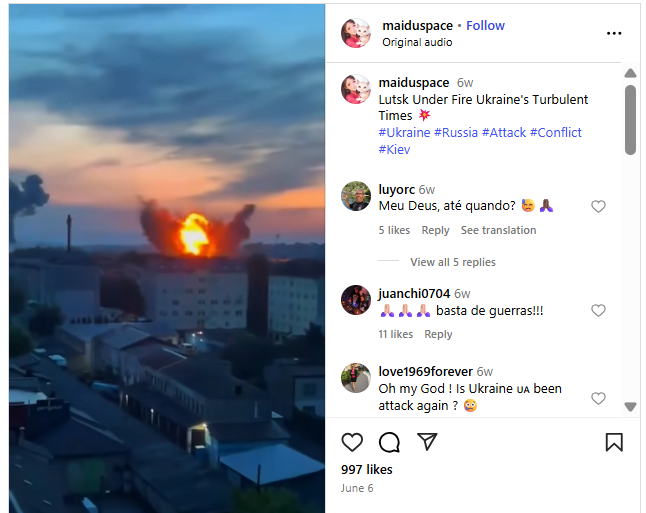 वीडियो के कीफ्रेम की मदद से रिवर्स इमेज सर्च करने पर हमें 6 जून 2025 को एक इंस्टाग्राम अकाउंट से अपलोड किया गया वीडियो मिला. वीडियो के साथ मौजूद कैप्शन में इसे यूक्रेन के लुत्स्क शहर में हुए हमले का बताया गया था.