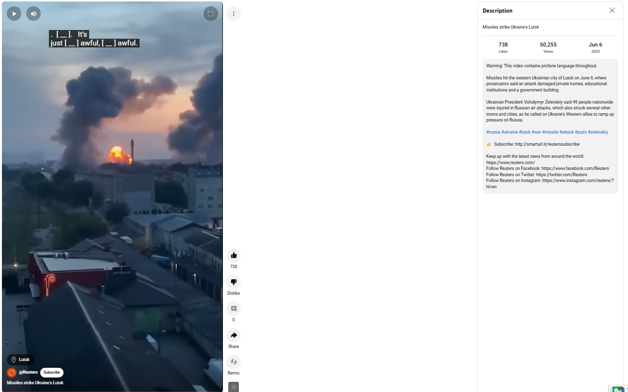 इसी दौरान हमें यह वीडियो समाचार एजेंसी रायटर्स के यूट्यूब अकाउंट से भी 6 जून 2025 को अपलोड किया गया मिला. वीडियो के साथ मौजूद डिस्क्रिप्शन में लिखा हुआ था, “6 जून को मिसाइलों ने पश्चिमी यूक्रेन के लुत्स्क शहर को निशाना बनाया, इस हमले में कई निजी मकानों, शैक्षणिक संस्थानों और एक सरकारी इमारत को नुकसान पहुंचा“.