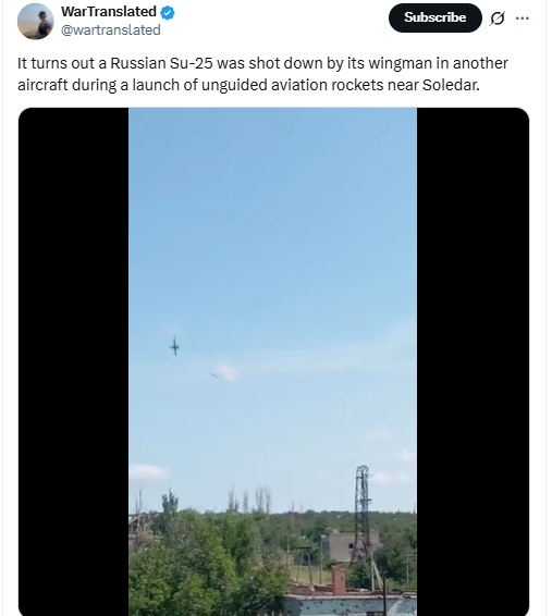 जांच को आगे बढ़ाते हुए हमने लड़ाकू विमान के गिरने वाले वीडियो की भी पड़ताल की. रिवर्स इमेज सर्च में हमें War Translated नाम के एक X अकाउंट से 13 जून 2025 को अपलोड किया गया यह वीडियो मिला. वीडियो के साथ मौजूद कैप्शन में बताया गया था कि “एक रूसी Su-25 विमान को उसके एक साथी विमान द्वारा ही मार गिराया गया”.