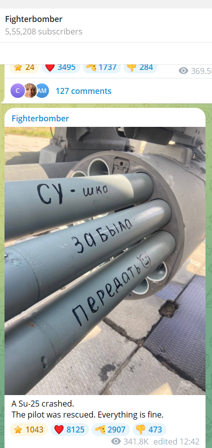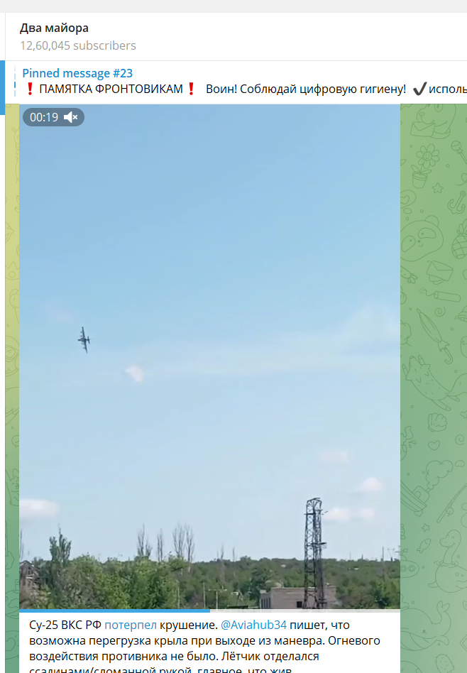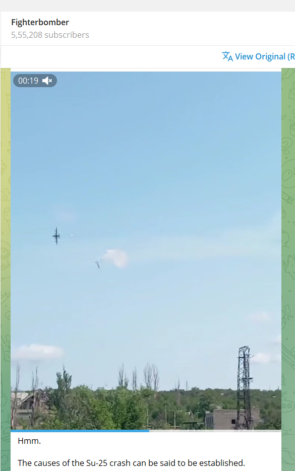 इसके बाद हमने रूसी टेलीग्राम चैनल Fighterbomber को खंगाला, जो रूसी हमलों से जुड़े दृश्य शेयर करती है. इस चैनल पर हमें 13 जून को किए गए दो पोस्ट मिले. पहले पोस्ट में एक Su-25 लड़ाकू विमान के क्रैश होने की जानकारी दी गई थी.