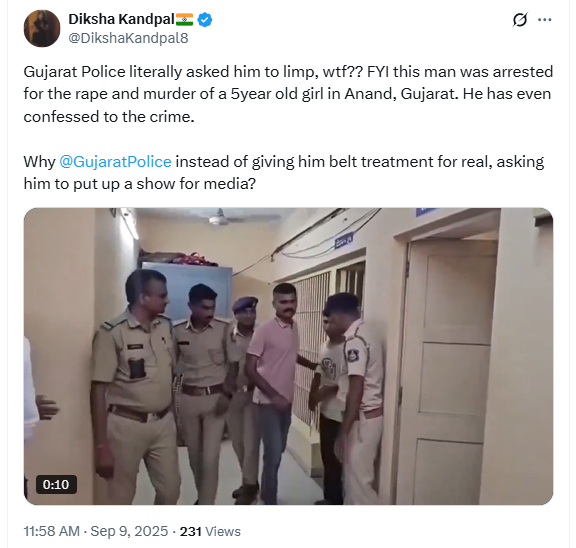 यूपी पुलिस के कहने पर अपराधी द्वारा लंगड़ाकर चलने के दावे से वायरल इस वीडियो की पड़ताल में कीफ़्रेम की मदद से रिवर्स इमेज सर्च करने पर हमें 9 सितंबर 2025 का एक X पोस्ट मिला, जिसमें इस वीडियो को गुजरात के आनंद का बताया गया था.