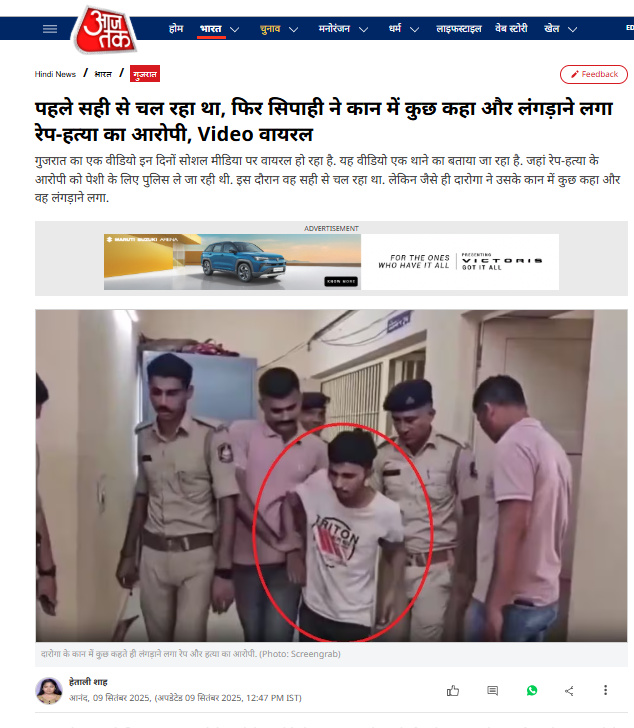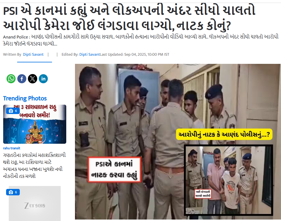 जांच में हमें इससे जुड़ी रिपोर्ट जी गुजराती की वेबसाइट पर भी प्रकाशित मिली. इस रिपोर्ट में भी बताया गया था कि यह घटना आंकलाव पुलिस थाने की ही है, जहां एक दारोगा के कहने पर रेप का आरोपी लंगड़ाकर चलने लगा था.