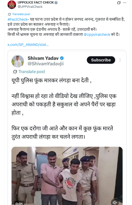 वीडियो को X पर वायरल दावे वाले कैप्शन के साथ शेयर किया गया है, जिसमें लिखा हुआ है “यूपी पुलिस का लंगड़ा वाला अजीबोगरीब कारनामा, पुलिस एक अपराधी को पकड़ती है सकुशल वो अपने पैरों पर खड़ा होता है. फ़िर एक दारोगा जी आते और कान में कुछ फूंक मारते तुरंत अपराधी की चाल लंगड़े वाले हो गई”.