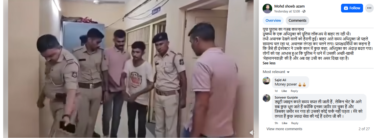 वायरल वीडियो करीब 14 सेकेंड का है, जिसमें कुछ पुलिसकर्मी एक व्यक्ति को हवालात से निकालकर कहीं ले जा रहे होते हैं. तभी एक अन्य पुलिसकर्मी उस व्यक्ति के पास जाकर कुछ कहते हैं और वह लंगड़ा-लंगड़ाकर चलने लगता है.