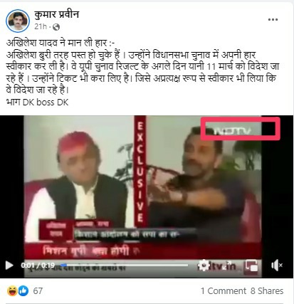 अखिलेश यादव ने चुनाव में हार मानते हुए यह स्वीकार किया है कि आगामी 11 मार्च को वह विदेश चले जाएंगे, दावे के साथ सोशल मीडिया पर वायरल वीडियो की सत्यता जानने के लिए हमने वीडियो को ध्यान से देखना शुरू किया। इस दौरान हमें वायरल वीडियो में NDTV का लोगो नजर आया, साथ ही वीडियो में अखिलेश यादव NDTV के एंकर श्रीनिवास जैन को इंटरव्यू देते नज़र आ रहे हैं।