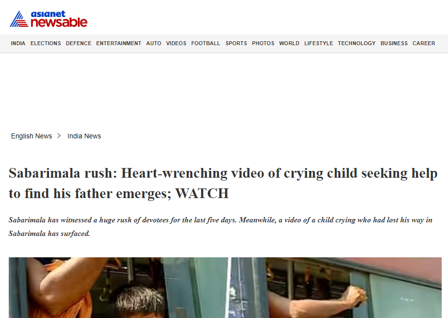 खोजने पर हमें एशिया नेट द्वारा 12 दिसंबर को छपी एक रिपोर्ट मिली, जिसमें लिखा गया है ‘सबरीमाला में रास्ता भटके एक बच्चे के रोने का वीडियो सामने आया है. फुटेज से पता चलता है कि बच्चा अपने पिता को ढूंढ रहा है, जो निलक्कल में भीड़ में खो गए थे। पुलिस के सामने हाथ जोड़कर चिल्लाने वाले बच्चे ने आखिरकार अपने पिता को देखकर हाथ हिलाया।’ इस रिपोर्ट्स से इतना तो स्पष्ट हो जाता है कि बच्चे को पुलिस द्वारा गिरफ्तार नहीं किया गया था, बल्कि बच्चा भीड़ में गुम हो गए अपने पिता को पुकार रहा था।