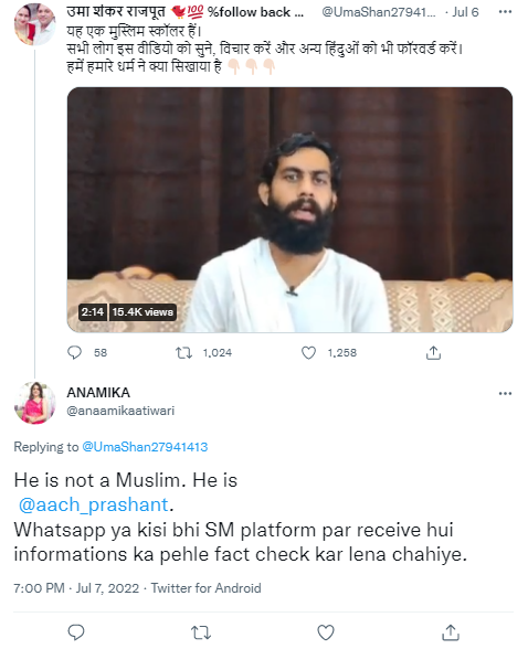 दावे की सत्यता जानने के लिए हमने एक वायरल ट्वीट के कमेंट बॉक्स को चेक किया। हमें एक यूजर का कमेंट मिला जिसमें लिखा था, ‘वीडियो में नज़र आ रहा व्यक्ति मुसलमान नहीं है। यह व्यक्ति @aach_prashant (आचार्य प्रशांत) हैं। सोशल मीडिया प्लेटफॉर्म पर प्राप्त हुई सूचनाओं का पहले फैक्ट चेक कर लेना चाहिए।’