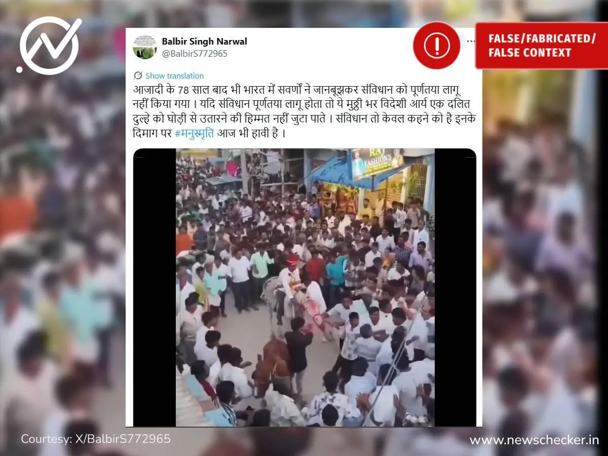 सोशल मीडिया पर एक वीडियो शेयर कर दावा किया गया कि ऊंची जाति के लोगों ने एक दलित दूल्हे को घोड़ी से उतार दिया। हमारी जांच में यह दावा गलत साबित हुआ। फैक्ट चेक यहां पढ़ें।