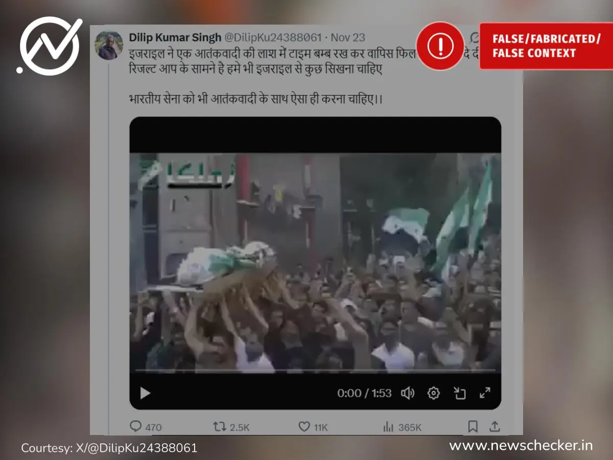 कई सोशल मीडिया यूजर्स ने दावा किया कि इजराइल ने एक आतंकी के शव में टाइम बम रखकर उसे फिलिस्तीन को सौंप दिया और उसकी शव यात्रा के दौरान उसे उड़ा दिया। हमारी जांच में यह दावा गलत साबित हुआ। फैक्ट चेक यहां पढ़ें।