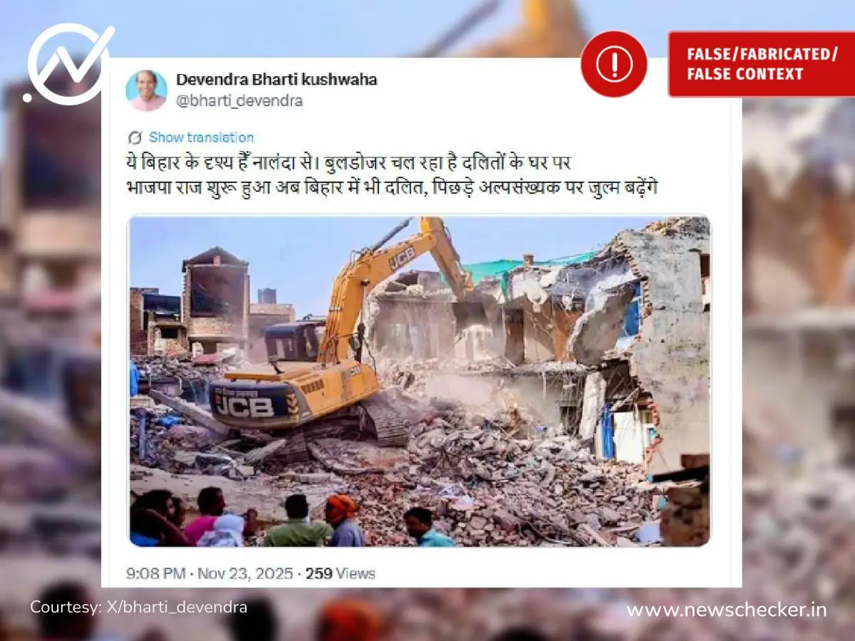सोशल मीडिया पर एक वीडियो शेयर कर दावा किया गया कि बिहार में नई सरकार बनने के बाद नालंदा में दलित के घर पर बुलडोजर चल गया। हमारी पड़ताल में यह दावा गलत साबित हुआ। रिपोर्ट यहां पढ़ें।