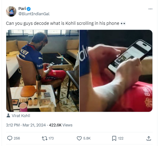 दावे की पड़ताल के लिए हमने तस्वीर को गूगल रिवर्स इमेज सर्च किया। हमें 21 मार्च, 2024 को @Blunt IndianGal नामक एक एक्स यूजर द्वारा शेयर किया गया पोस्ट मिला। पोस्ट में विराट कोहली की ऐसी ही तस्वीर शेयर की गयी है, जिसके कैप्शन में लिखा है – “क्या आप लोग डिकोड कर सकते हैं कि कोहली अपने फोन में क्या स्क्रॉल कर रहे हैं।”