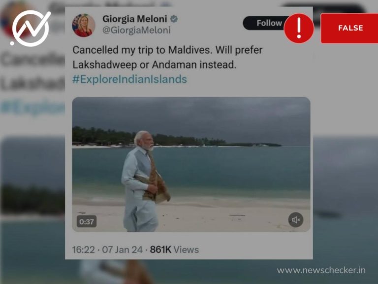मालदीव बनाम लक्षद्वीप विवाद के बीच एक पोस्ट के जरिए दावा किया गया कि इटली की पीएम जियोर्जिया मेलोनी ने मालद्वीप का दौरा कैंसिल कर दिया है। हमारी जांच में यह दावा फर्जी निकला। फैक्ट चेक यहां पढ़ें।