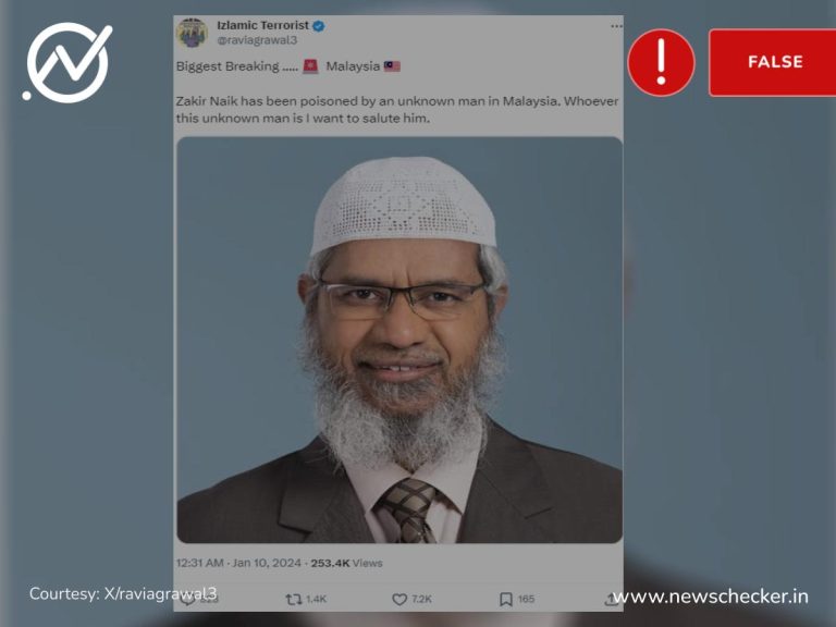 सोशल मीडिया पर यूजर्स यह दावा करने लगे कि विवादित इस्लामिक उपदेशक जाकिर नाइक को एक अज्ञात व्यक्ति ने जहर दे दिया है। हमारी जांच में यह दावा फर्जी साबित हुआ। फैक्ट चेक यहां पढ़ें।