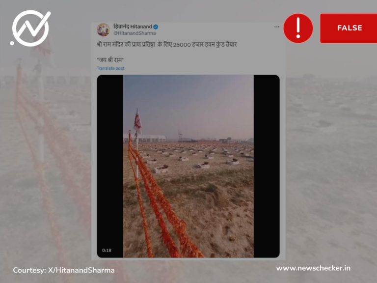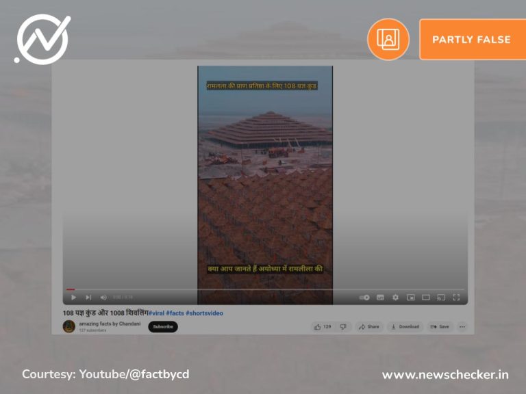 सोशल मीडिया यूजर्स ने एक वीडियो के जरिए दावा किया कि अयोध्या में रामलला की प्राण प्रतिष्ठा के लिए 108 यज्ञ कुण्ड तैयार किये जा रहे हैं। हमारी जांच में यह दावा भ्रामक साबित हुआ। पूरा फैक्ट चेक यहां पढ़ें।