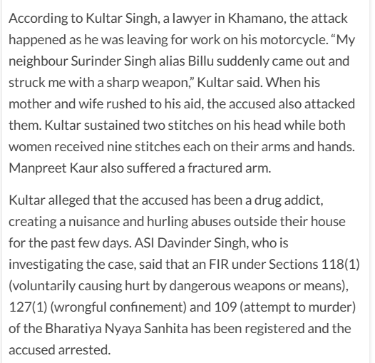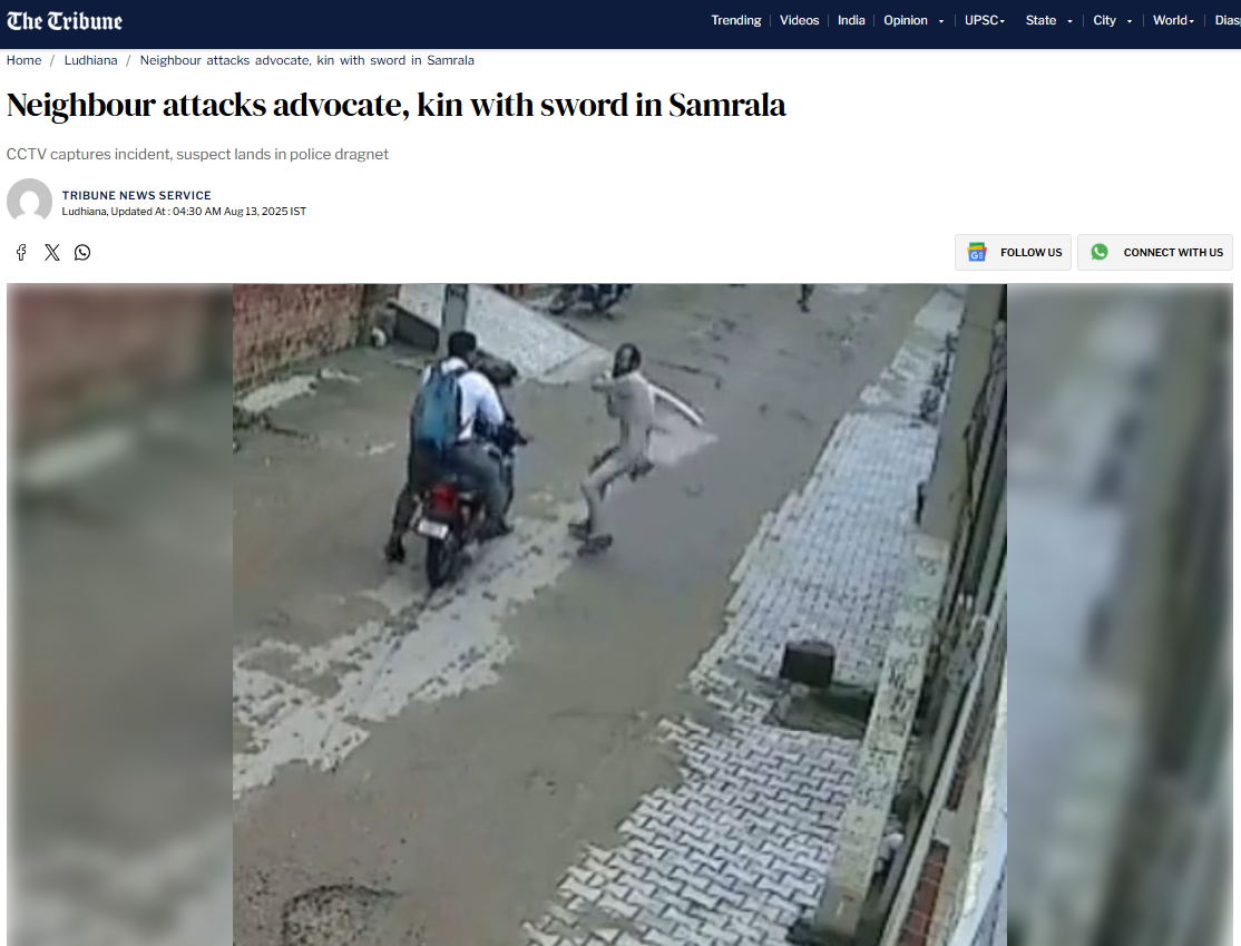 इसके अलावा, हमें इस घटना से जुड़ी रिपोर्ट हिंदुस्तान टाइम्स की वेबसाइट पर 13 अगस्त 2025 को भी प्रकाशित मिली. रिपोर्ट में वकील कुलतार सिंह का बयान मौजूद था. कुलतार सिंह के अनुसार, उसका पड़ोसी सुरिंदर सिंह उर्फ बिल्लू नशे का आदी है. वह पिछले कुछ दिनों से उनके घर के बाहर शोर-शराबा कर रहा था और गालियां दे रहा था. इसी दौरान सोमवार को सुरिंदर सिंह ने उसके ऊपर धारदार हथियार से हमला कर दिया और जब उसकी मां और पत्नी उन्हें बचाने आई तो बिल्लू ने उसपर भी हमला कर दिया. समराला पुलिस ने आरोपी के खिलाफ भारतीय न्याय संहिता की धारा 118(1), 127(1) और 109 के तहत मामला दर्ज किया था.