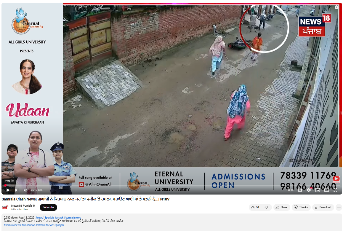 जांच में हमें इस संबंध में 12 अगस्त 2025 को न्यूज 18 पंजाब के यूट्यूब अकाउंट से अपलोड की गई वीडियो रिपोर्ट मिली. वीडियो रिपोर्ट में वायरल सीसीटीवी फुटेज और पीड़ित वकील कुलतार सिंह का बयान भी मौजूद था. कुलतार सिंह ने अपने बयान में सुरिंदर सिंह पर हमले का आरोप और सुरिंदर सिंह के मां-बाप पर उसे शह देने का आरोप लगाया था.
