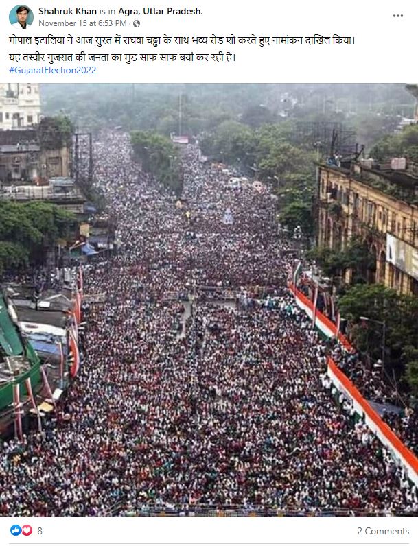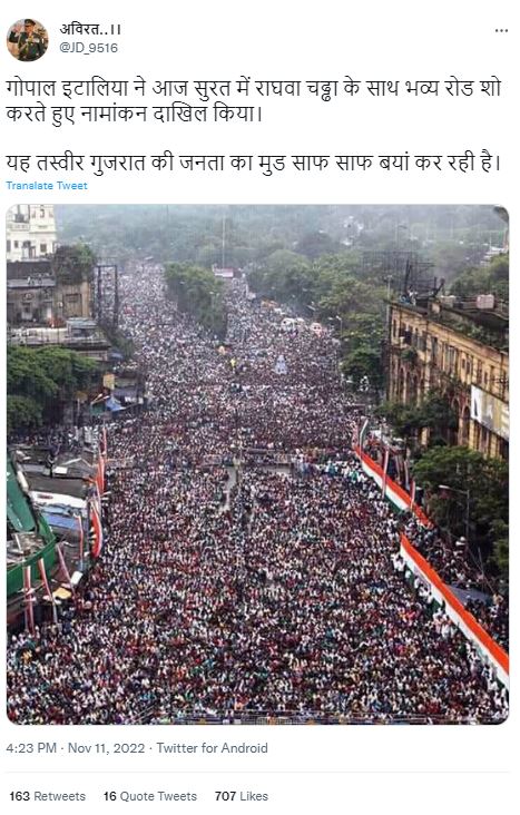 गुजरात विधानसभा चुनाव की तैयारियों के बीच सोशल मीडिया पर एक फोटो वायरल है। इसमें में एक भव्य रोड शो नज़र आ रहा है। इसे शेयर कर दावा किया जा रहा कि आम आदमी पार्टी नेता गोपाल इटालिया ने आज सूरत में राघव चड्ढा के साथ भव्य रोड शो करते हुए नामांकन दाखिल किया। साथ ही कहा जा रहा है कि ये तस्वीर गुजरात की जनता का मूड साफ-साफ बयां कर रही है।