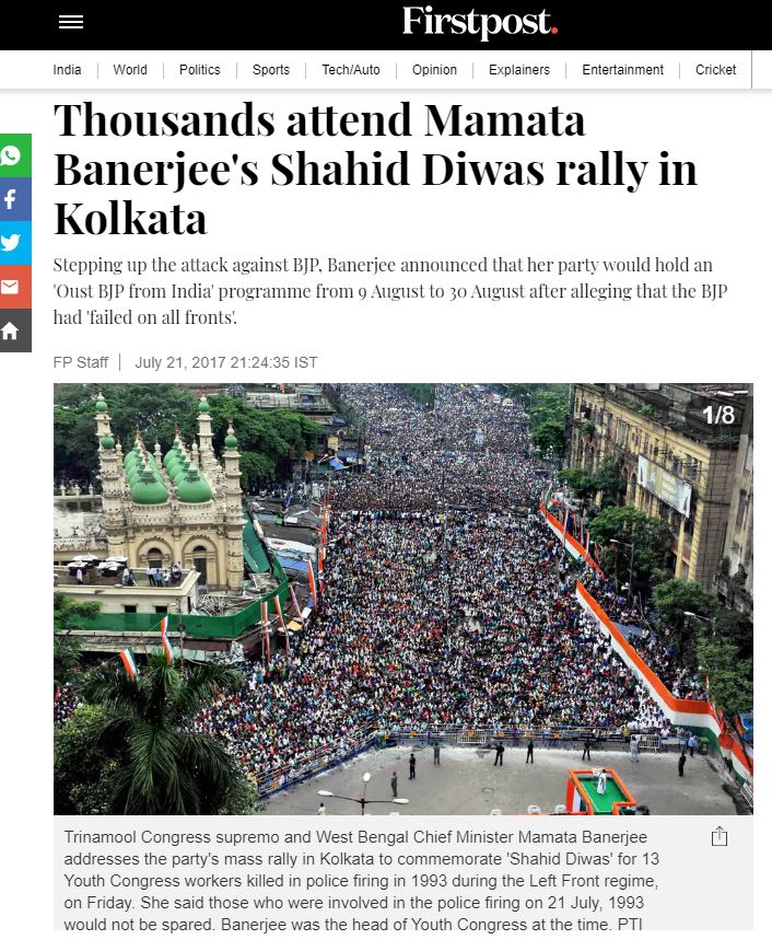पड़ताल के दौरान हमें मीडिया वेबसाइट Firstpost पर 21 मई 2017 को छपी एक रिपोर्ट में भी वायरल तस्वीर मिली। रिपोर्ट के अनुसार, पश्चिम बंगाल की मुख्यमंत्री ममता बनर्जी ने 1993 में पुलिस गोलीबारी में मारे गए 13 युवा TMC कार्यकर्ताओं की याद में ‘शहीद दिवस’ मनाने के लिए कोलकाता में पार्टी की जन रैली को संबोधित किया।