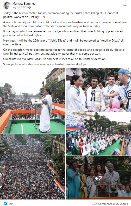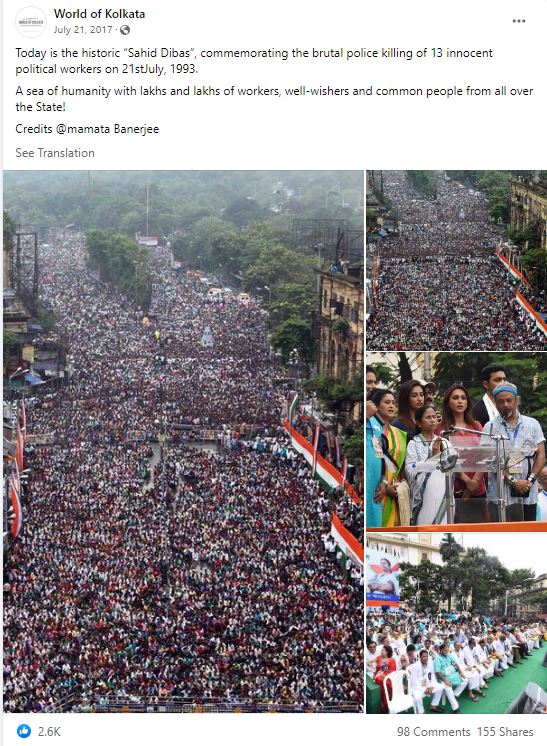दावे की सत्यता जानने के लिए हमने वायरल तस्वीर को रिवर्स सर्च किया। हमें यह तस्वीर World of Kolkata के फेसबुक पेज पर मिली। पोस्ट को 21 मई 2017 को अपलोड किया गया था। उसके कैप्शन में लिखा है कि पश्चिम बंगाल में 21 जुलाई को 1993 को पुलिस द्वारा 13 निर्दोष राजनीतिक कार्यकर्ताओं की क्रूर हत्या की याद में आज ऐतिहासिक ‘शहीद दिवस’ मनाया गया।