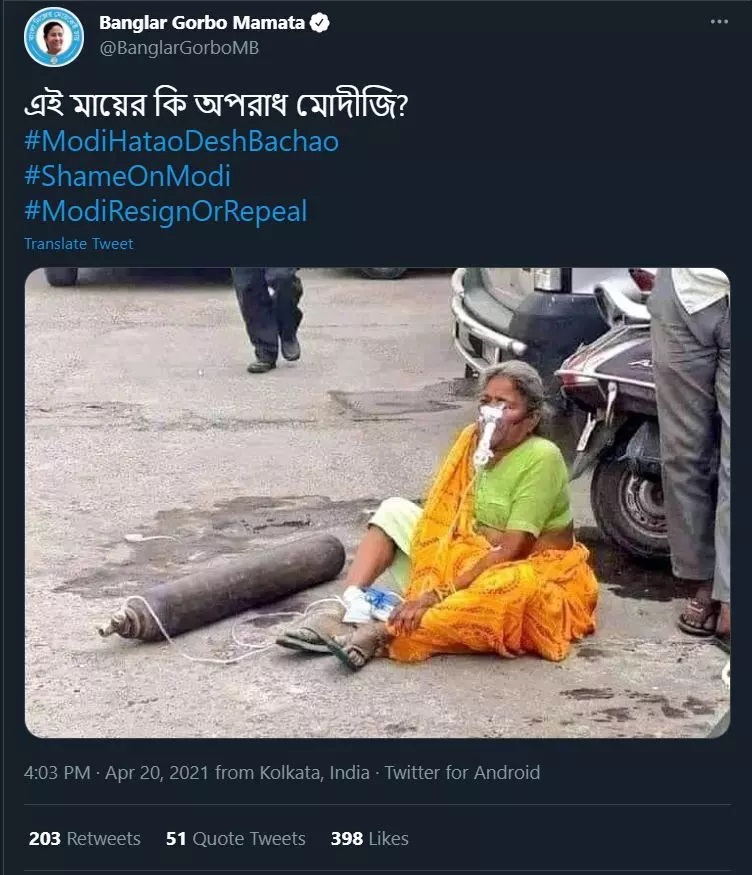 इसी बीच सड़क किनारे ऑक्सीजन लगाकर बैठी महिला की तस्वीर सोशल मीडिया पर काफी वायरल हो रही है। इस तस्वीर को हालिया समय का बताया जा रहा है। साथ ही पीएम मोदी पर तंज कसते हुए कहा जा रहा है कि लोग कोरोना के कारण बीमार हो रहे हैं। परन्तु उनकी मौत का कारण ‘बीमार व्यवस्था’ है।