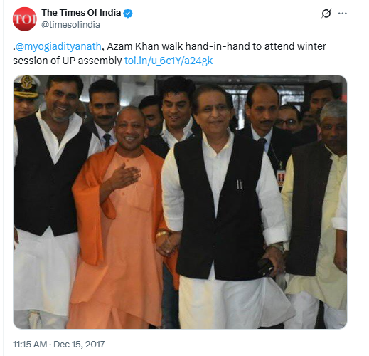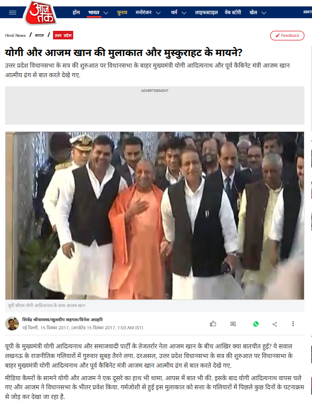 रिपोर्ट में बताया गया था कि उत्तर प्रदेश विधानसभा के सत्र की शुरुआत पर विधानसभा के बाहर मुख्यमंत्री योगी आदित्यनाथ और पूर्व कैबिनेट मंत्री आजम खान बात करते हुए देखे गए थे. मीडिया कैमरों के सामने योगी और आजम ने एक दूसरे का हाथ भी थामा था और आपस में बात भी की थी. इसके बाद योगी आदित्यनाथ वापस चले गए और आजम भी विधानसभा चले गए थे.