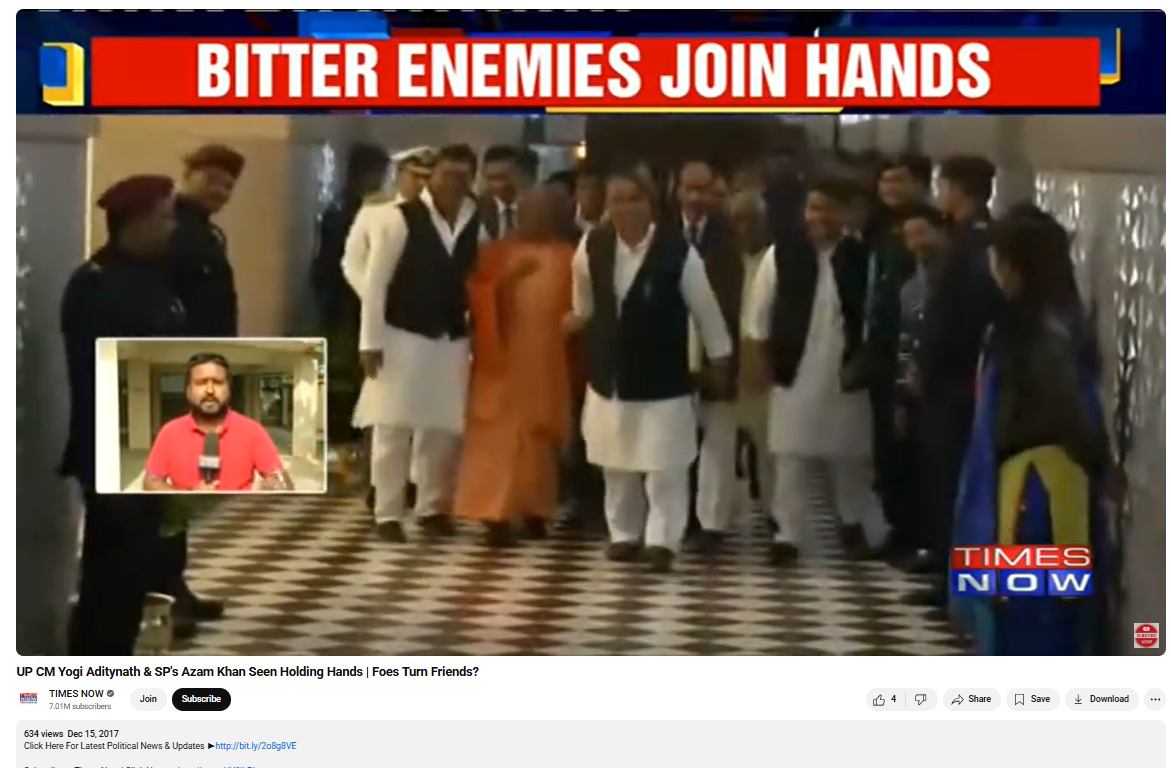 जांच में हमें टाइम्स नाउ के यूट्यूब अकाउंट पर 15 दिसंबर 2017 को अपलोड की गई वीडियो रिपोर्ट मिली, जिसमें वायरल वीडियो भी मौजूद था. इस रिपोर्ट में भी वीडियो को विधानसभा भवन में आजम खान और योगी आदित्यनाथ के बीच मुलाक़ात का बताया गया था.