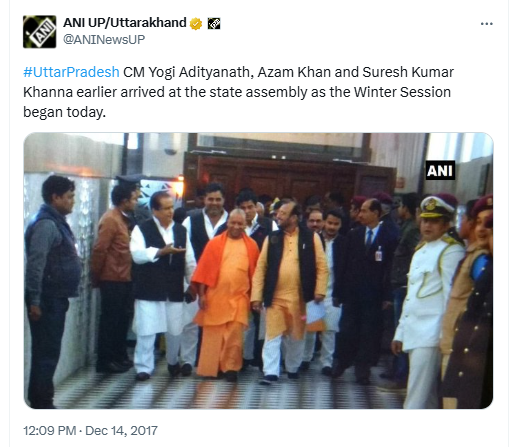 इसके अलावा, हमें वायरल वीडियो से जुड़ी तस्वीर समाचार एजेंसी एएनआई उत्तर प्रदेश उत्तराखंड के X अकाउंट से 14 दिसंबर 2017 को अपलोड की गई मिली. तस्वीर के साथ मौजूद कैप्शन में लिखा हुआ था, “मुख्यमंत्री योगी आदित्यनाथ, आजम खान और सुरेश कुमार खन्ना शीतकालीन सत्र की शुरुआत पर विधानसभा पहुंचे”.
