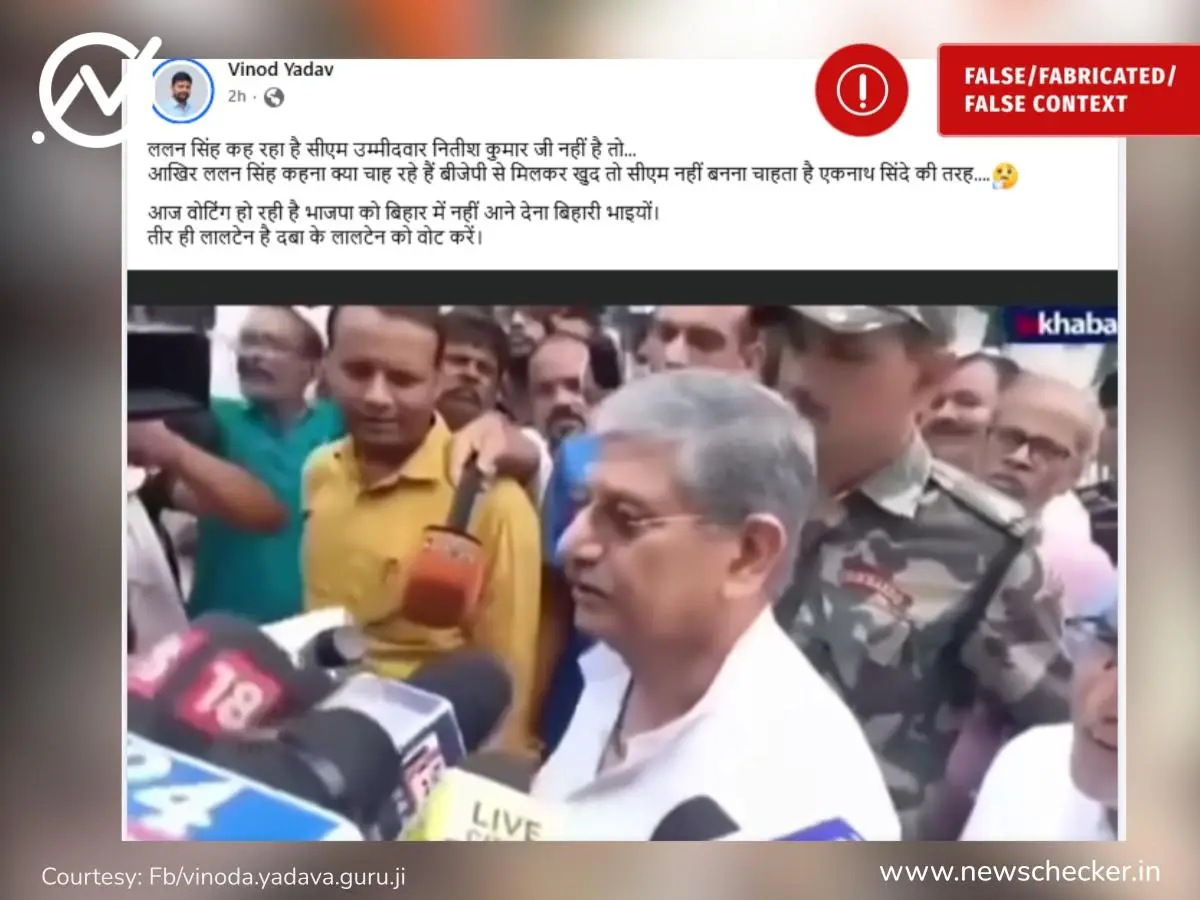 सोशल मीडिया पर एक वीडियो शेयर कर दावा किया गया कि जेडीयू नेता ललन सिंह ने कहा कि नीतीश कुमार सीएम पद के उम्मीदवार नहीं हैं। हमारी जांच में यह दावा गलत निकला। फैक्ट चेक यहां पढ़ें।