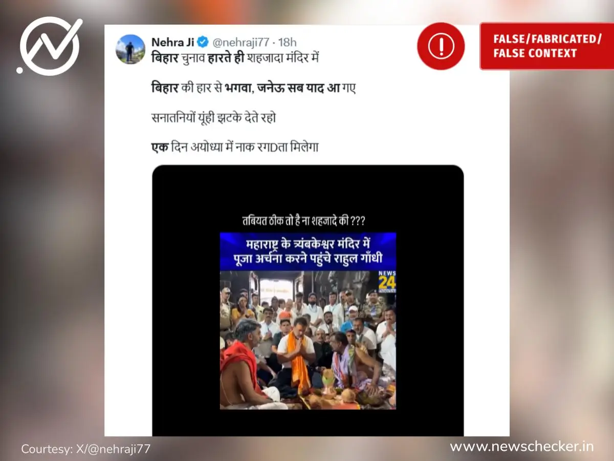 सोशल मीडिया पर एक वीडियो शेयर कर दावा किया गया कि बिहार विधानसभा चुनाव में हार के बाद राहुल गांधी महाराष्ट्र के त्रयंबकेश्वर मंदिर में पूजा करने पहुंच गए। हमारी पड़ताल में यह दावा गलत साबित हुआ। फैक्ट चेक यहां पढ़ें।