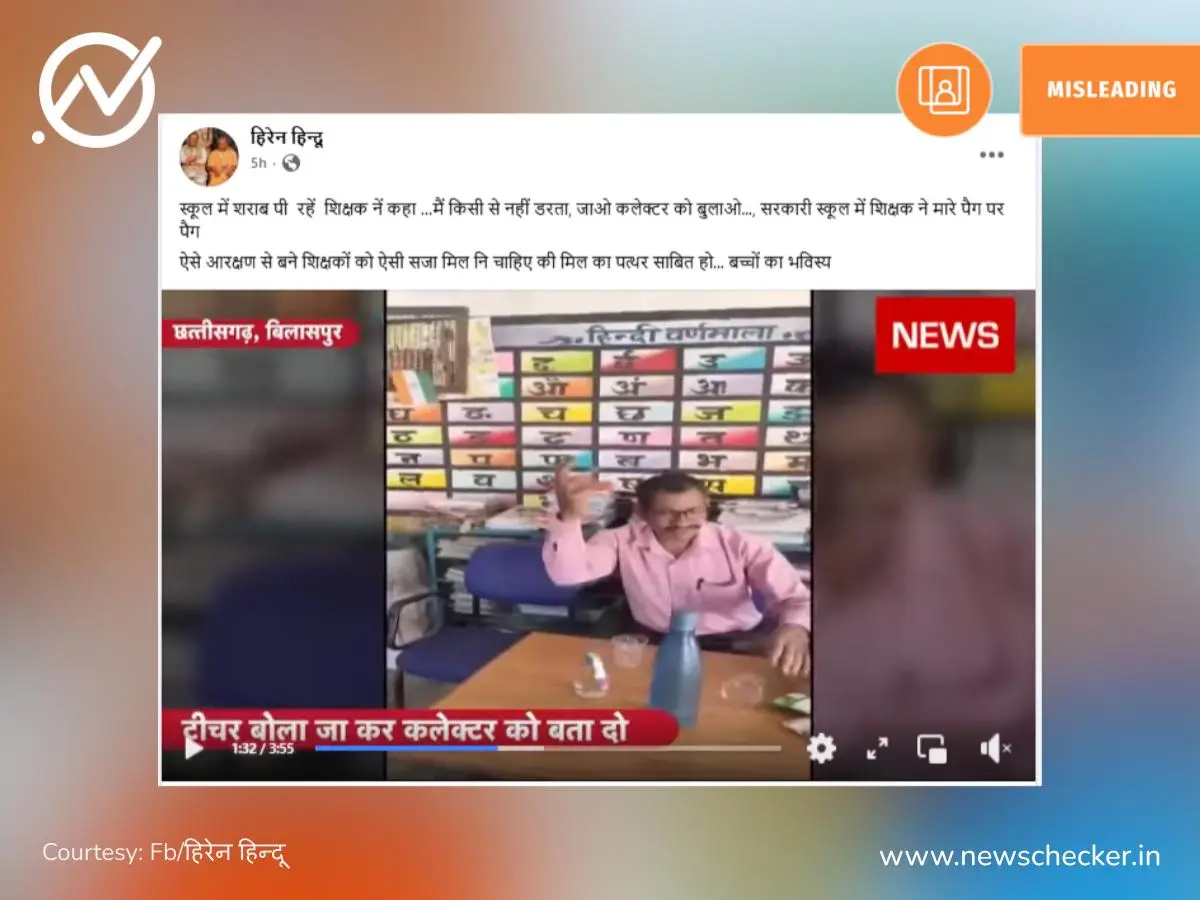 स्कूल में शराब पीकर हुड़दंग मचाते टीचर का का एक वीडियो सोशल मीडिया पर वायरल हो गया। कई यूजर्स इस टीचर पर कार्रवाई की भी मांग करने लगे। हमारी जांच में पता चला कि यह वीडियो पुराना है और शिक्षक की सेवाएं समाप्त की जा चुकी हैं। फैक्ट चेक यहां पढ़ें।
